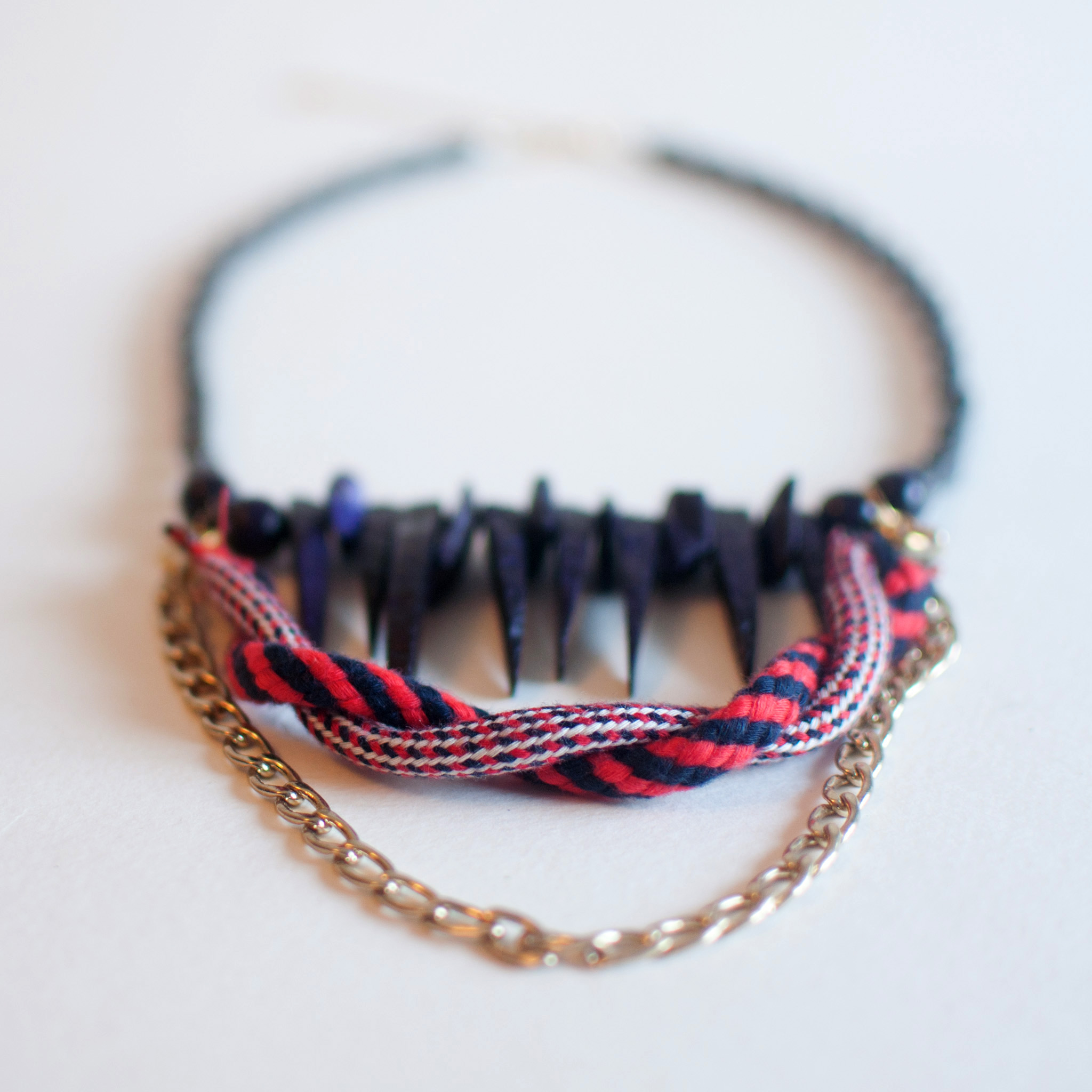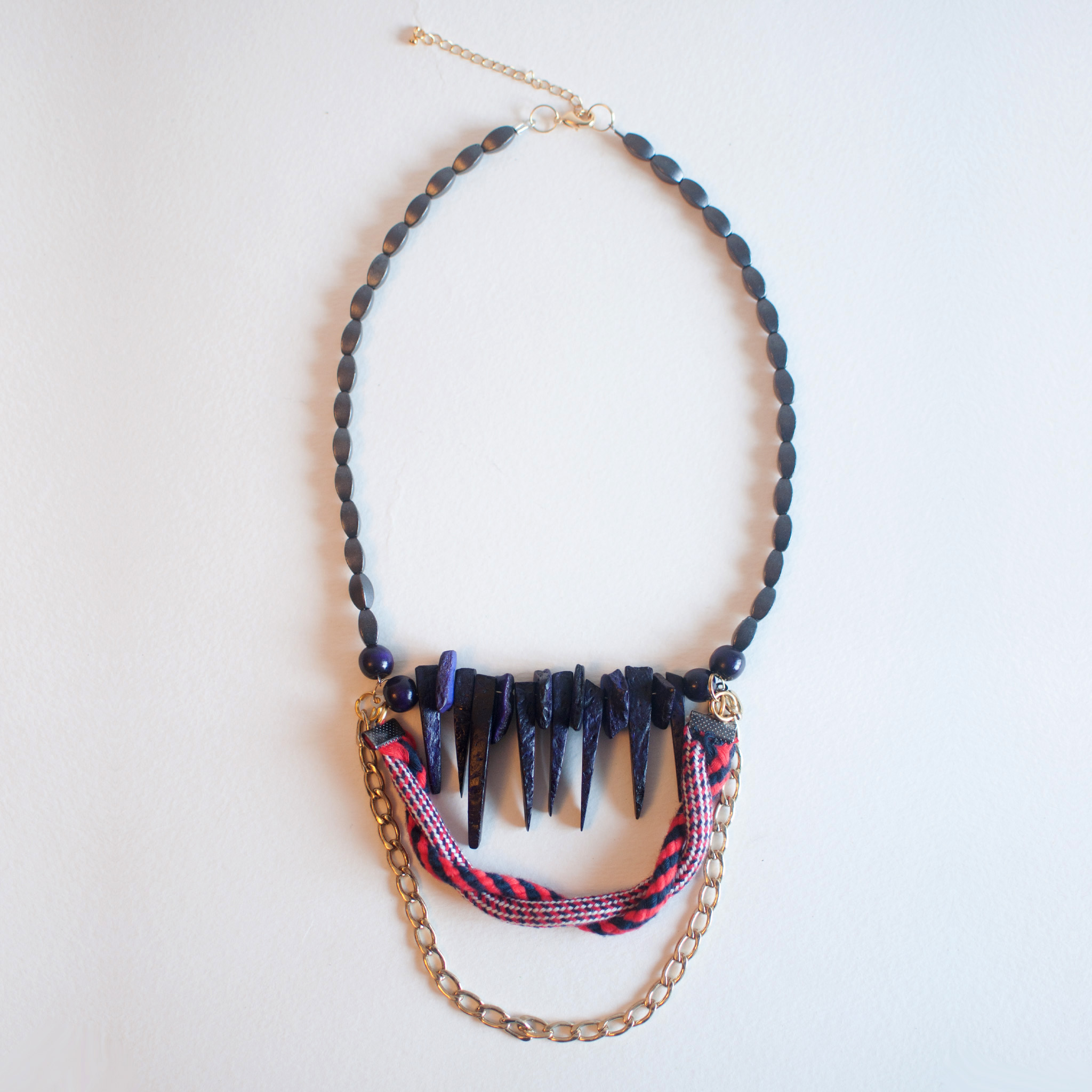 Length: 18" Extender: 2 1/2" Lobster clasp closure Weight: 55g Wood / natural stone / fiber / cotton / acrylic / gold plated