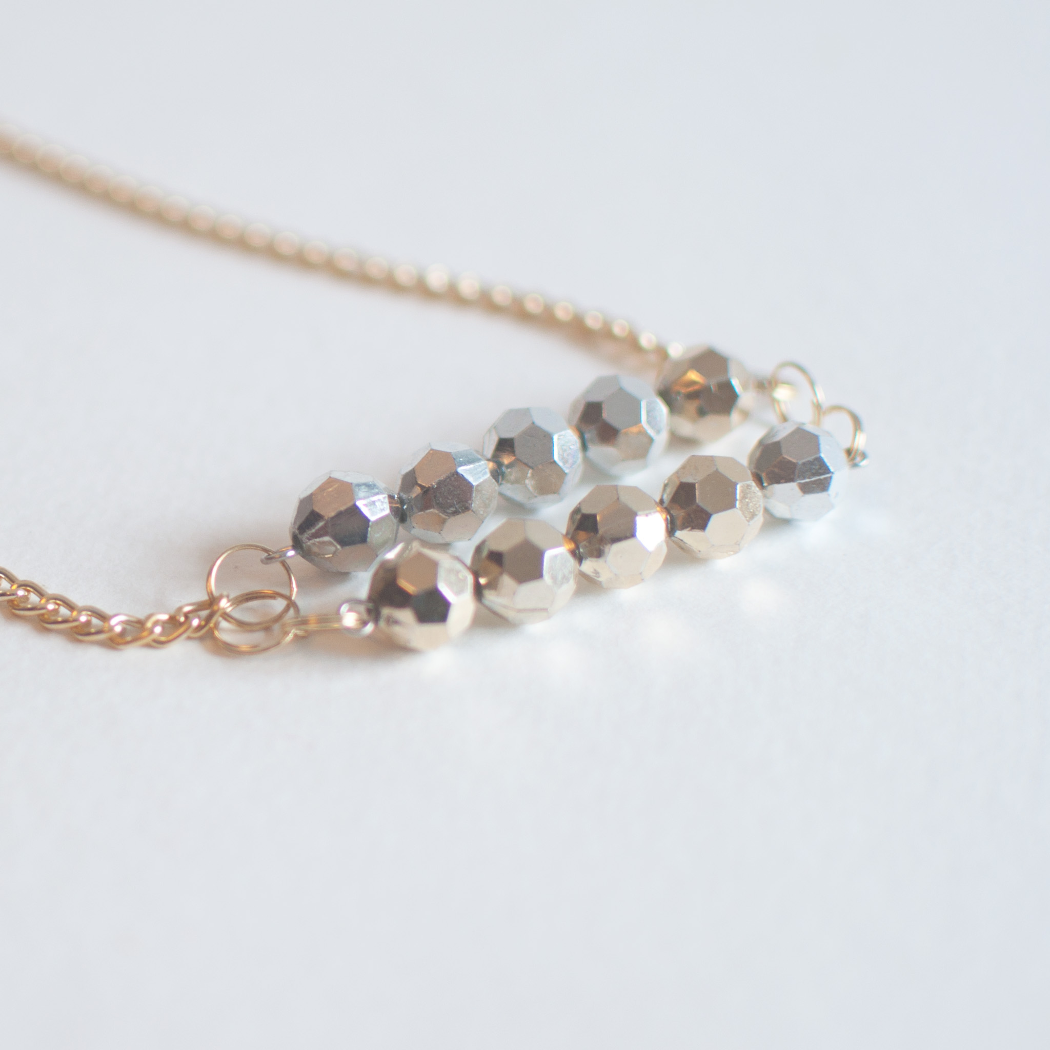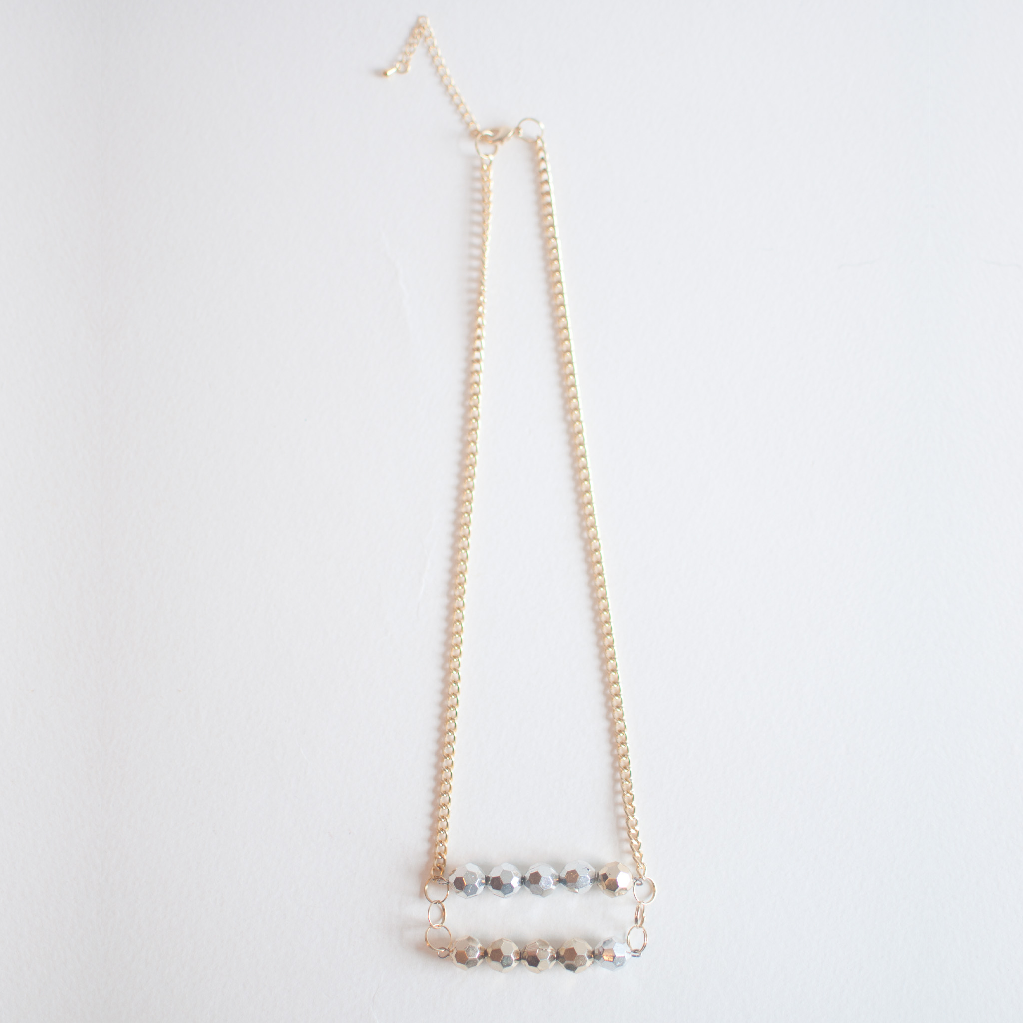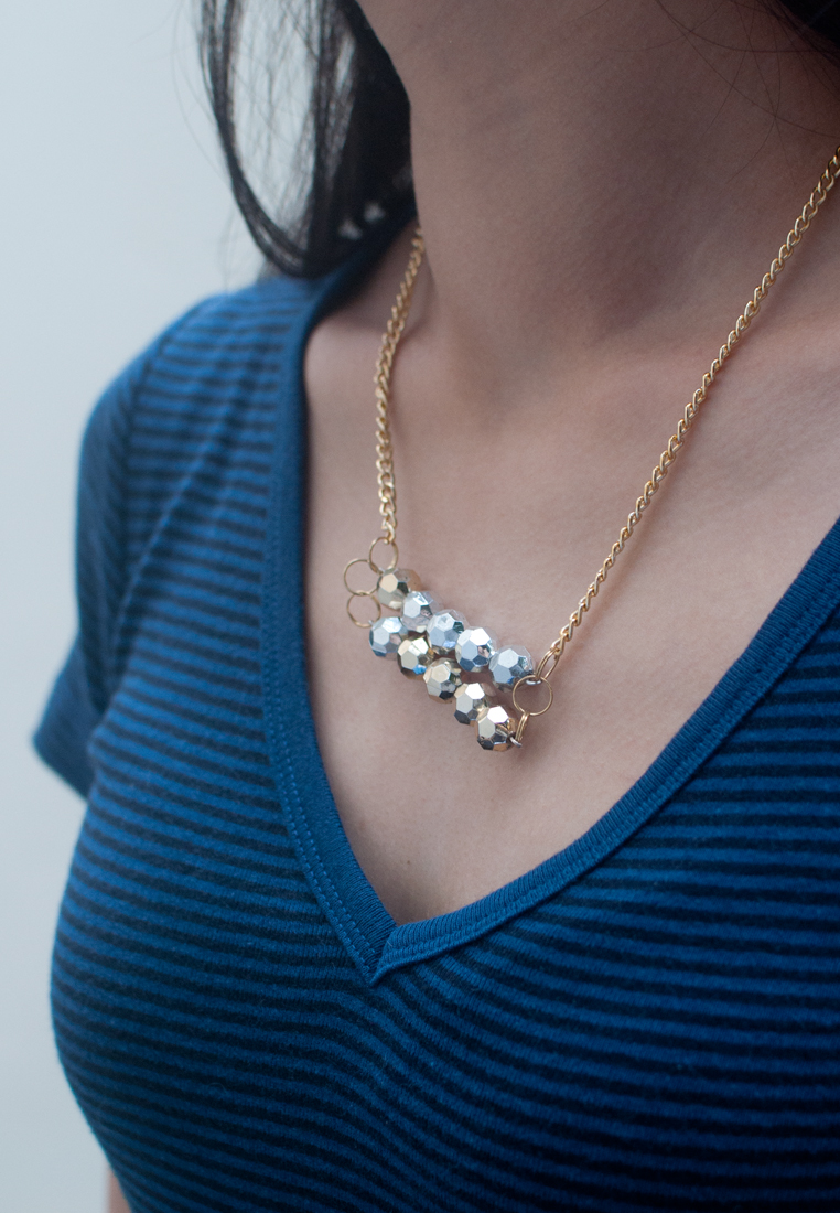 Strands of metal beads define a shimmering pendant necklace that pairs nicely with any outfit.