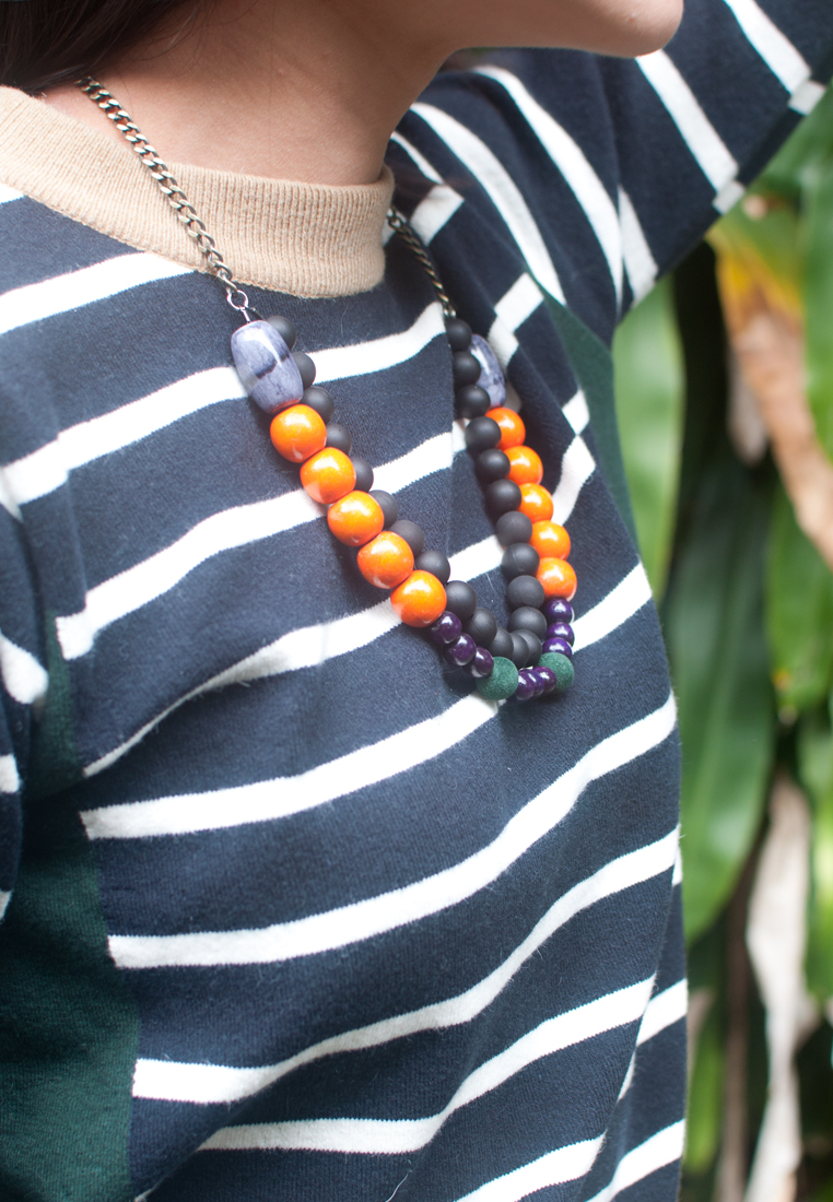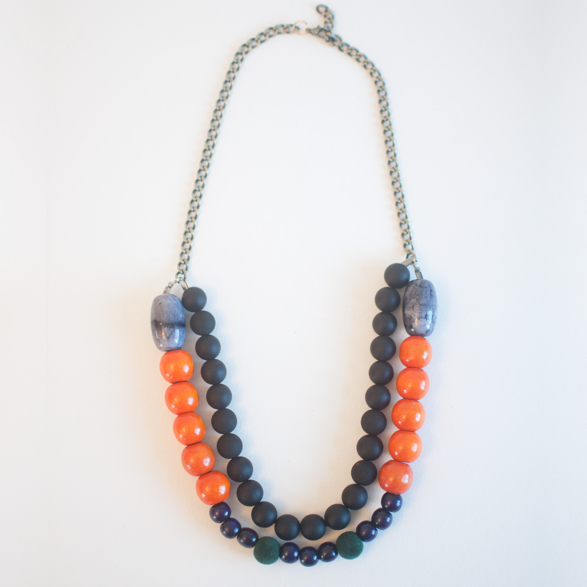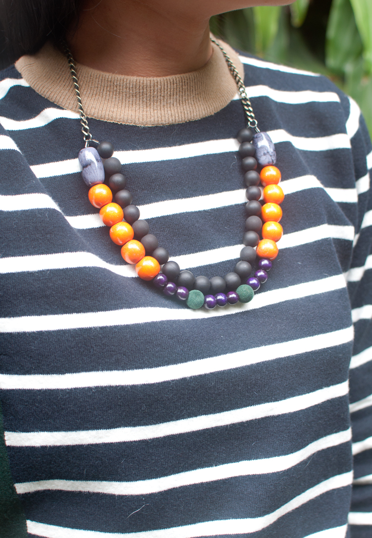 Polished mixed-color beads turn from utilitarian to couture creating a statement necklace with plenty of attitude.
