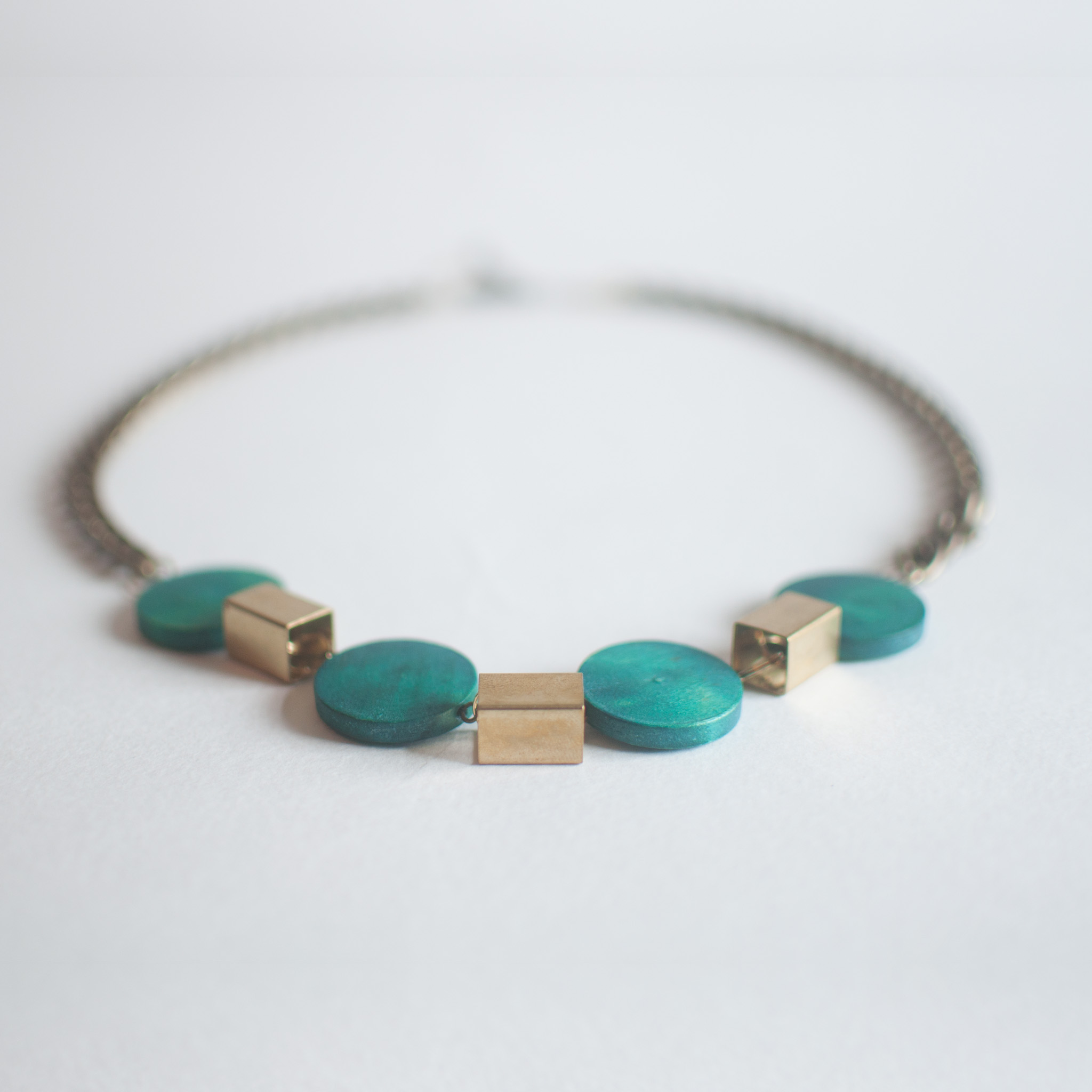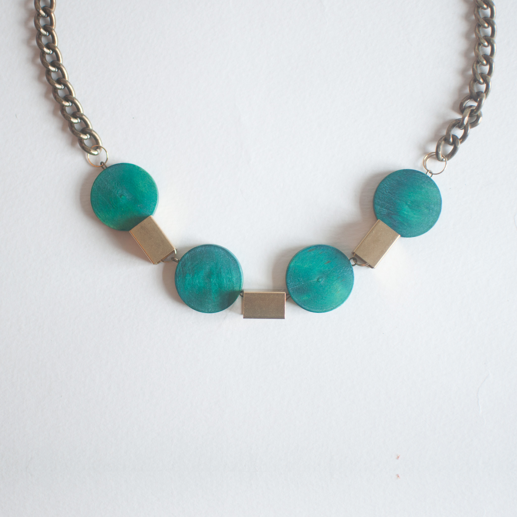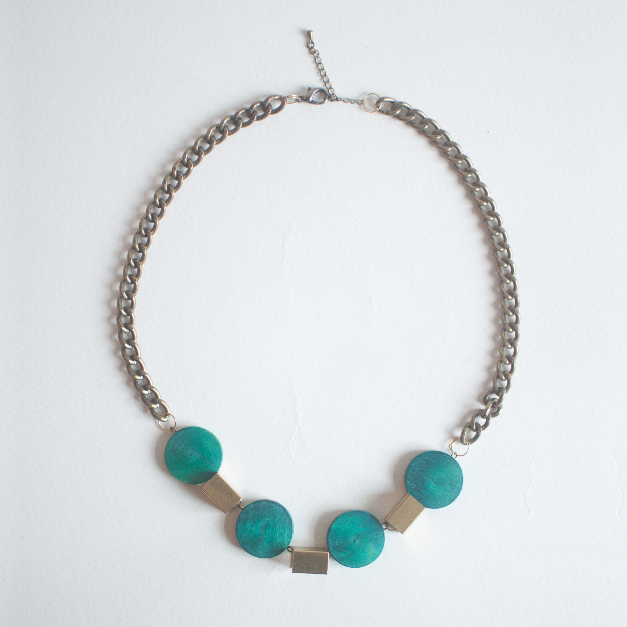 Gold Metal Green Wooden Round Disc Cirle Statement Necklace NL0758