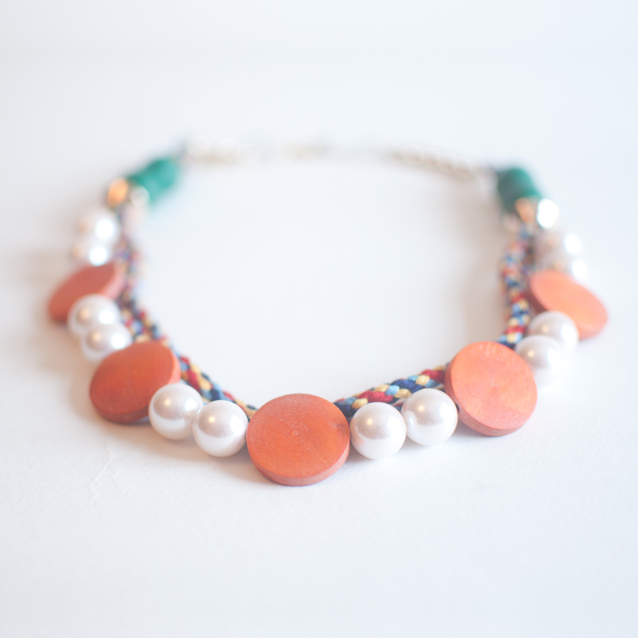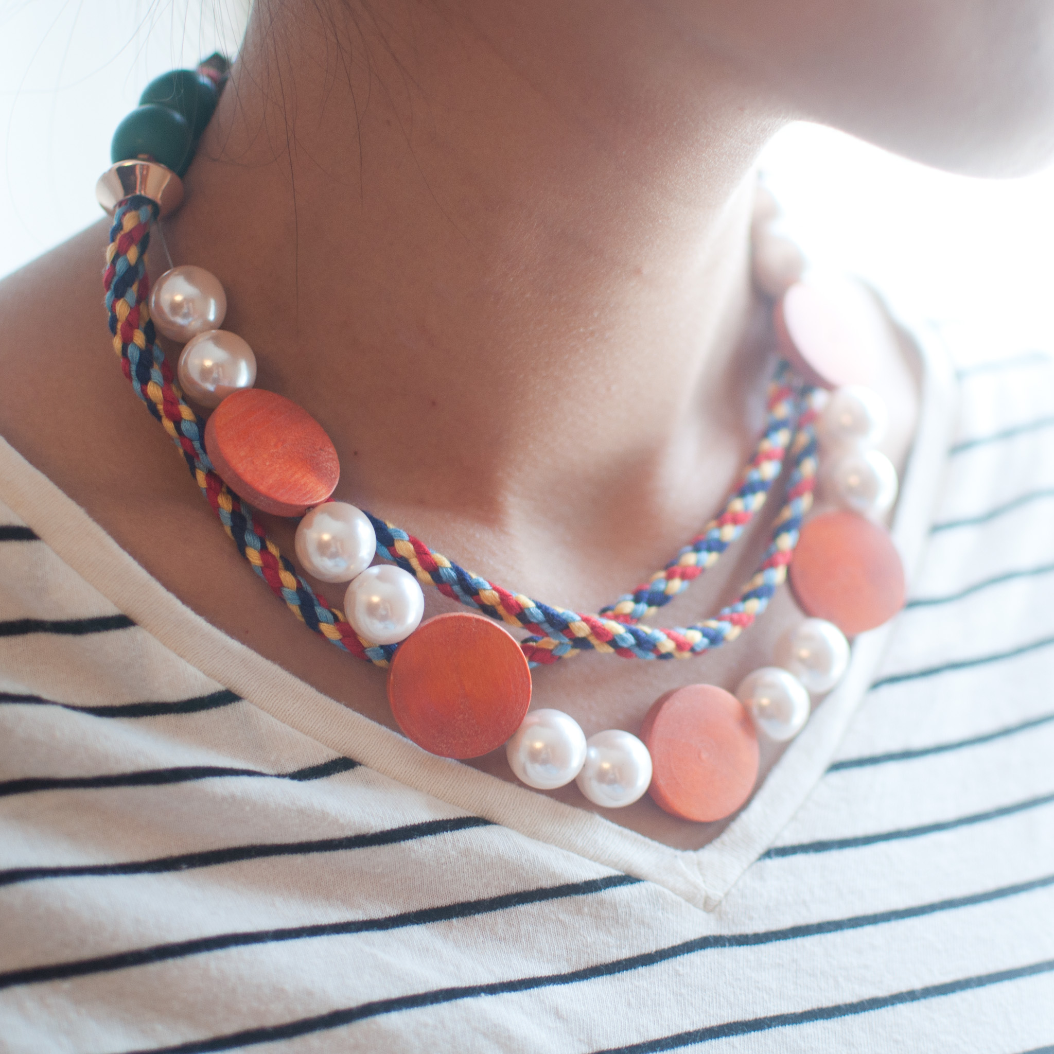 A chunky handcrafted necklace offers an impressive pop of color with three strands of faceted beads.