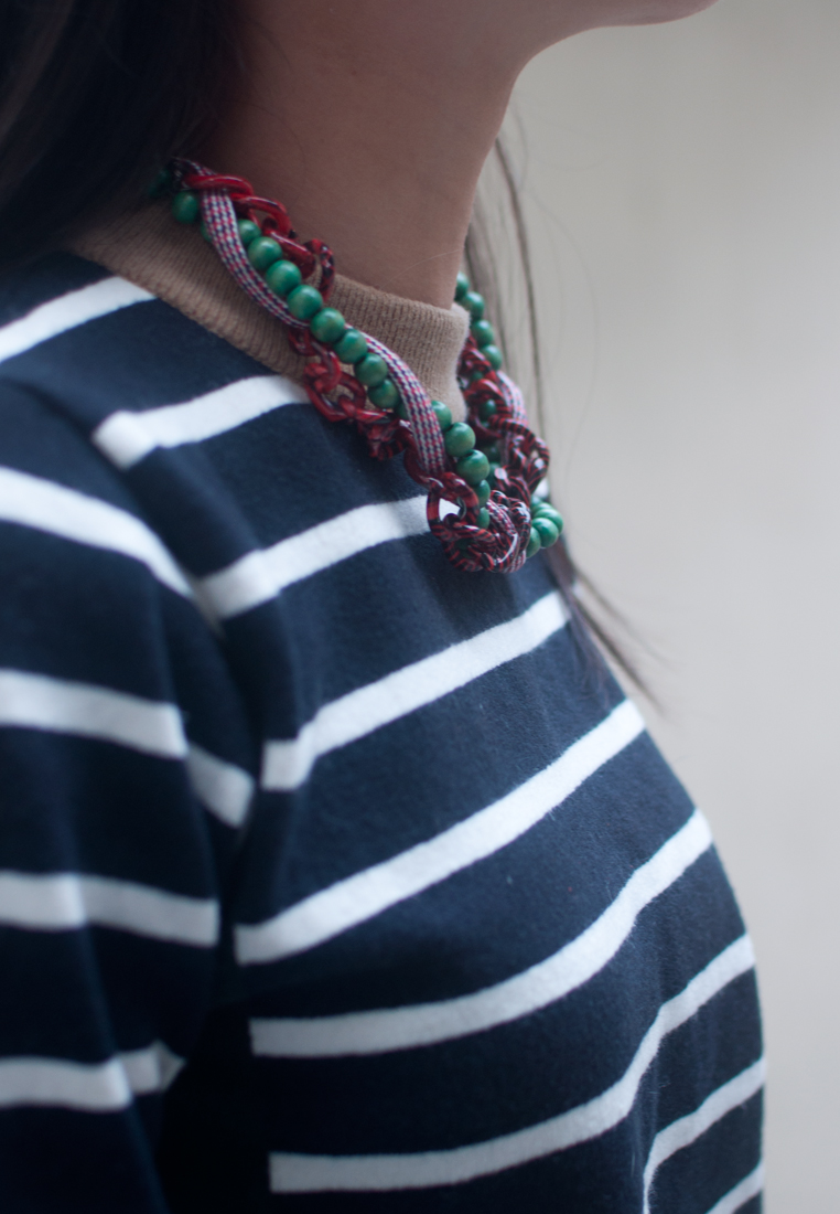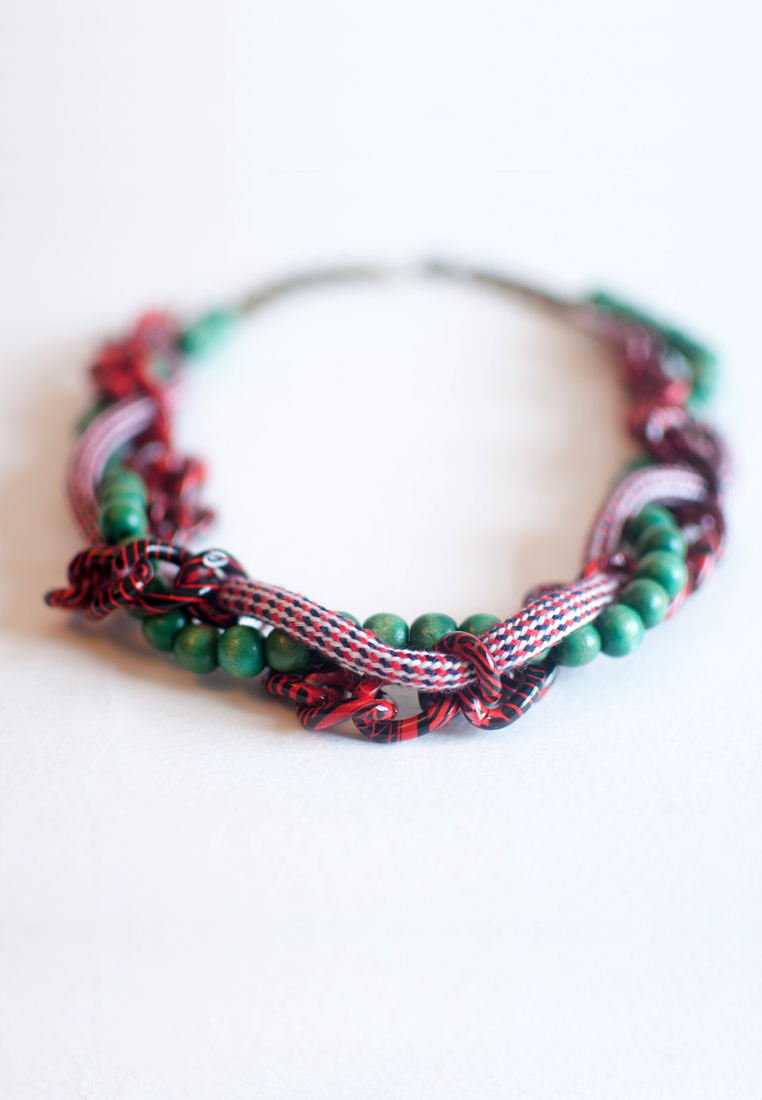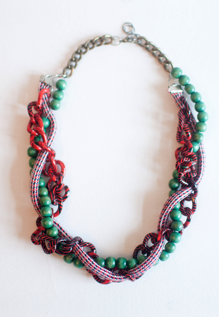 Chunky strands of cotton rope and beaded chain form a dramatic statement necklace.