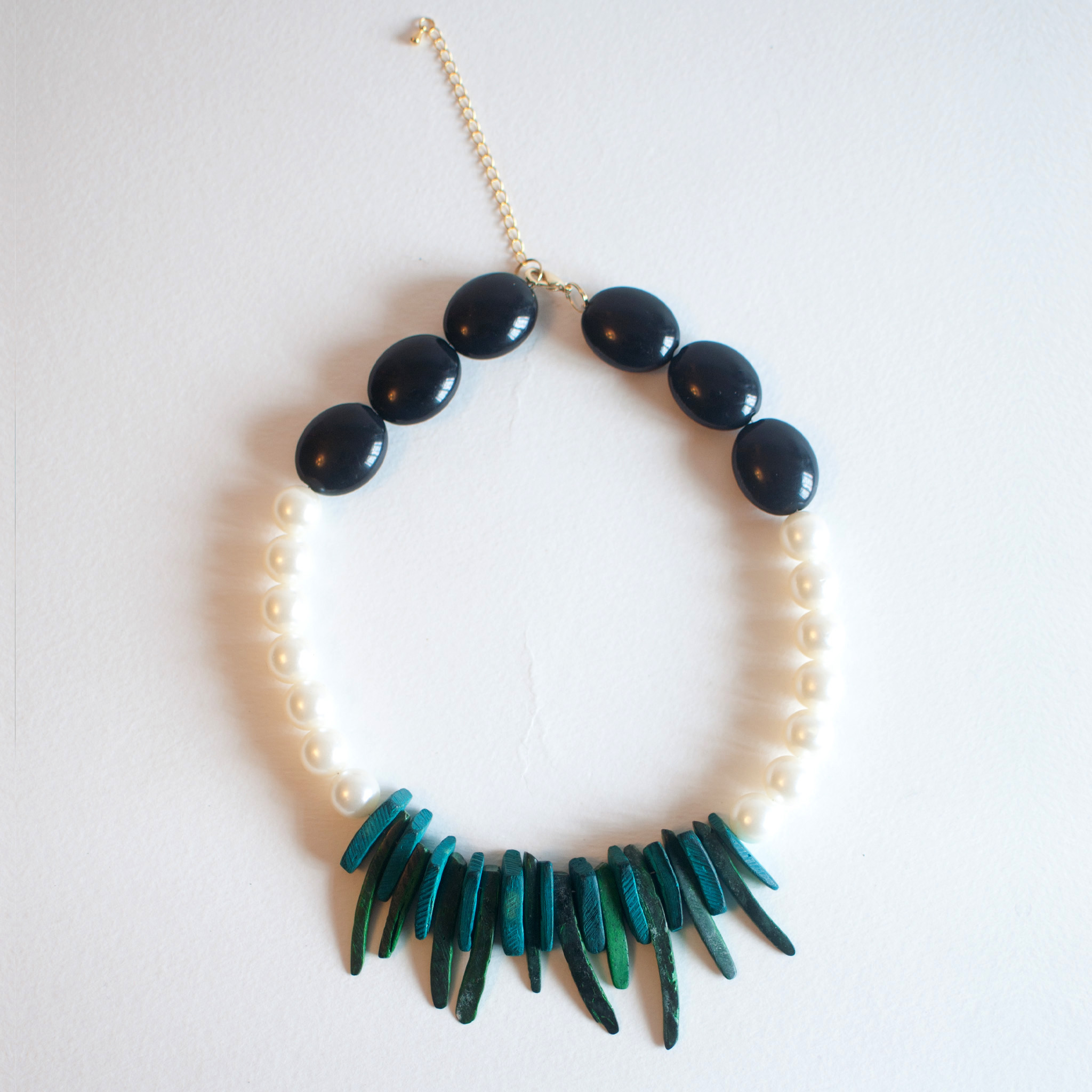 Vintage Black & White Green Wooden Long Beaded Necklace NL0688