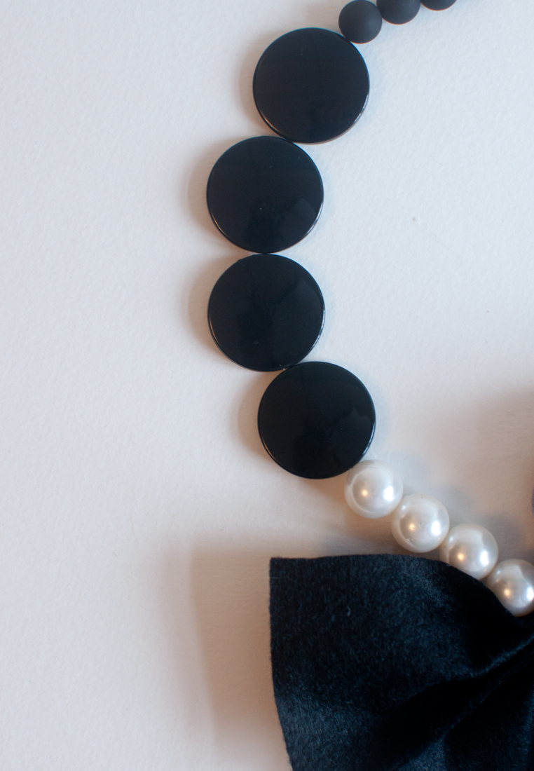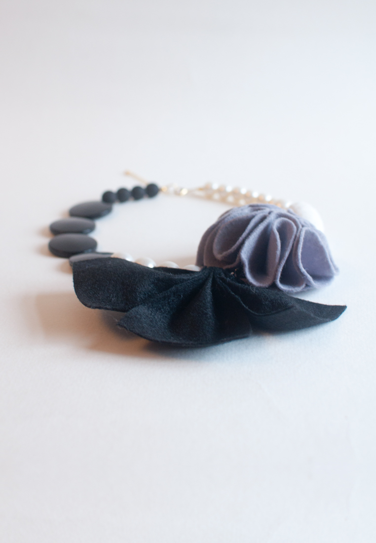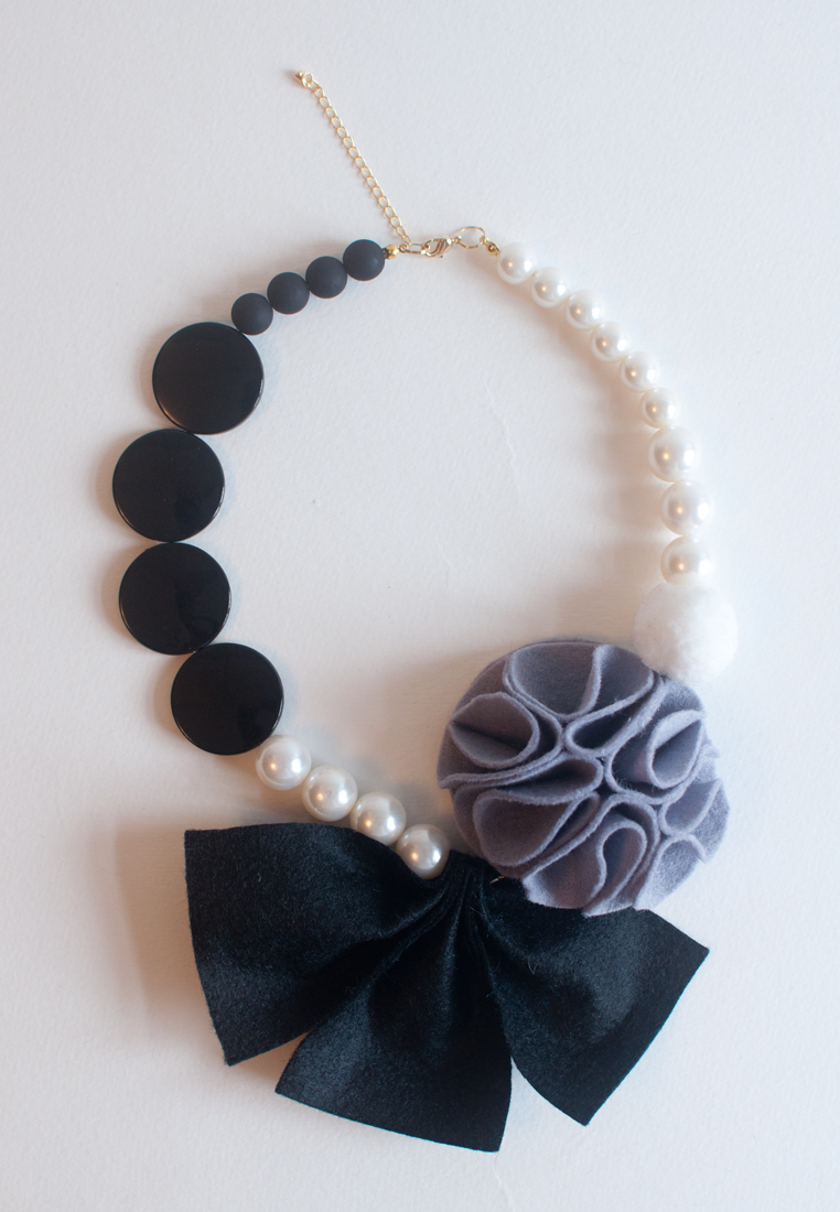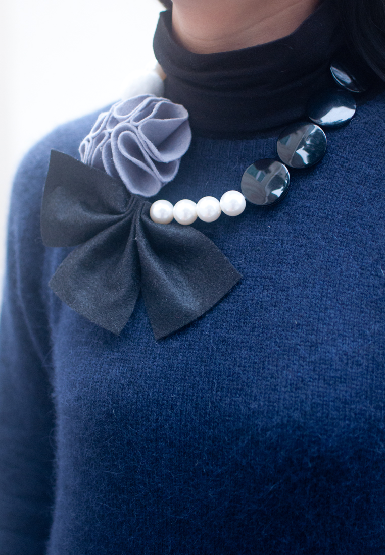 Mixed felt shapes form an eye-catching statement necklace styled with a cool vintage look.