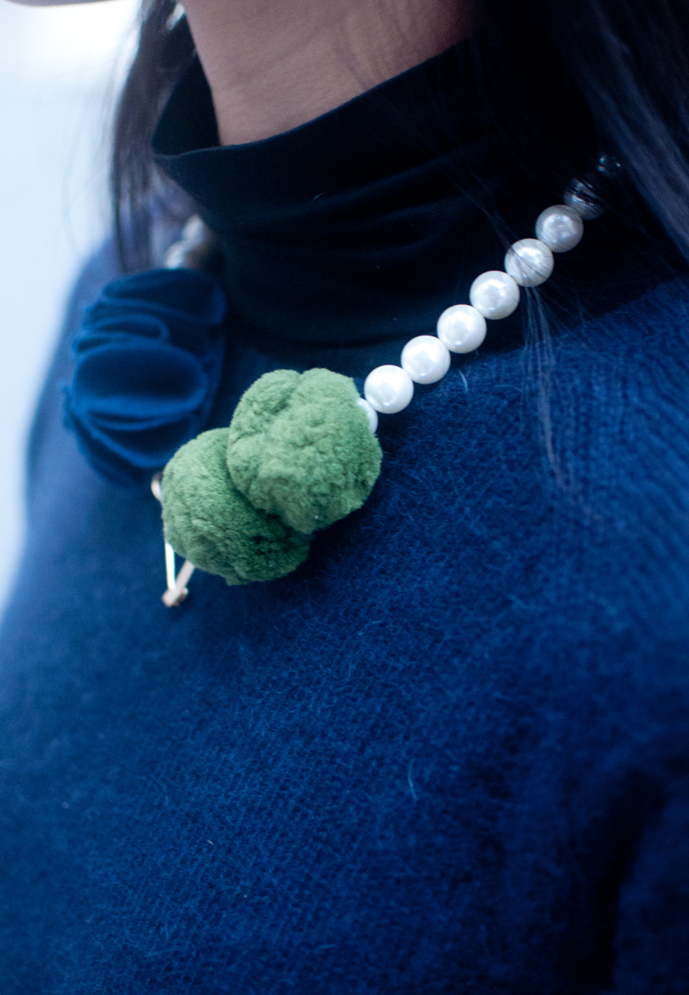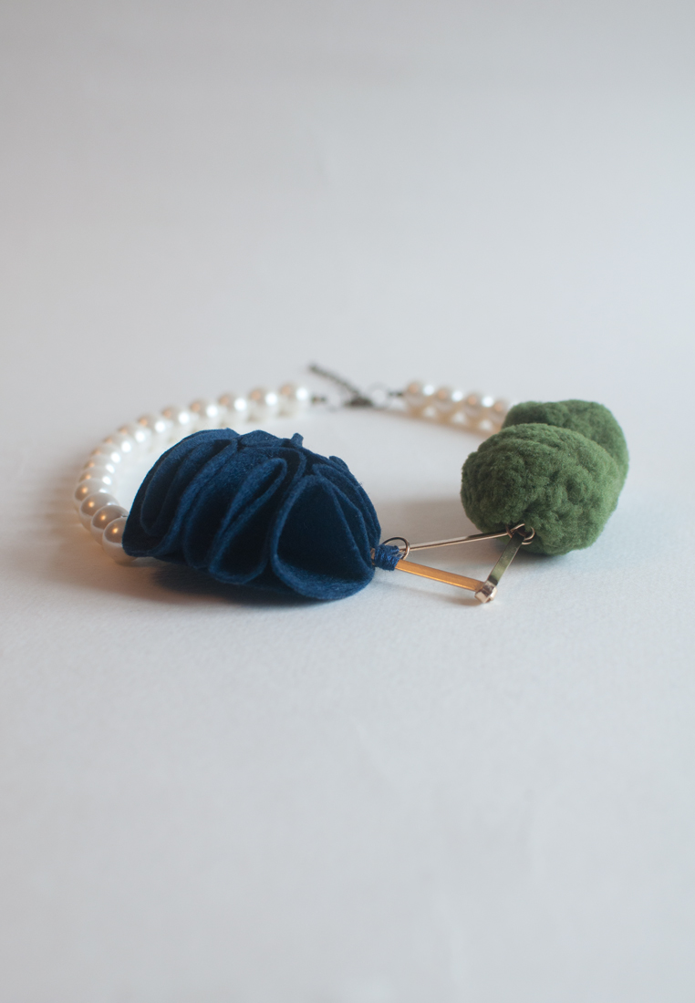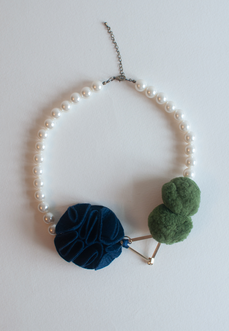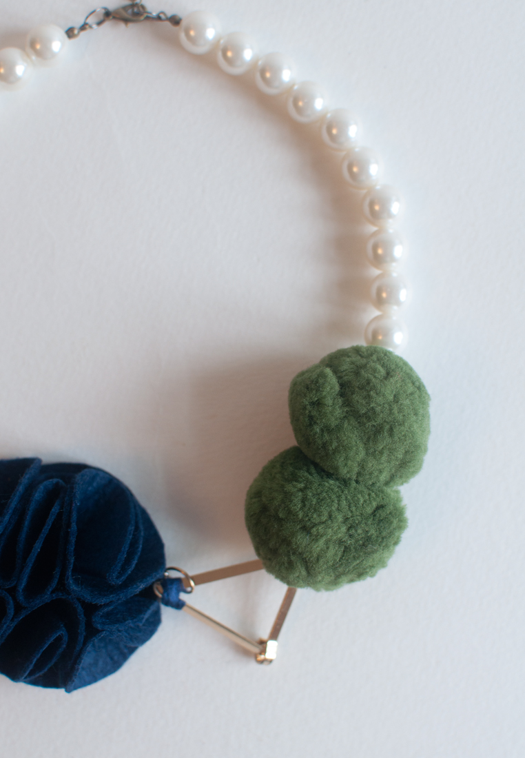 Navy Blue Felt Flower Green Balls Statement Necklace NL0828