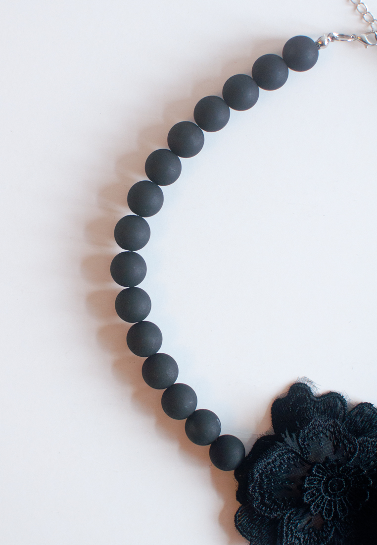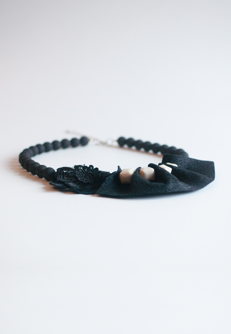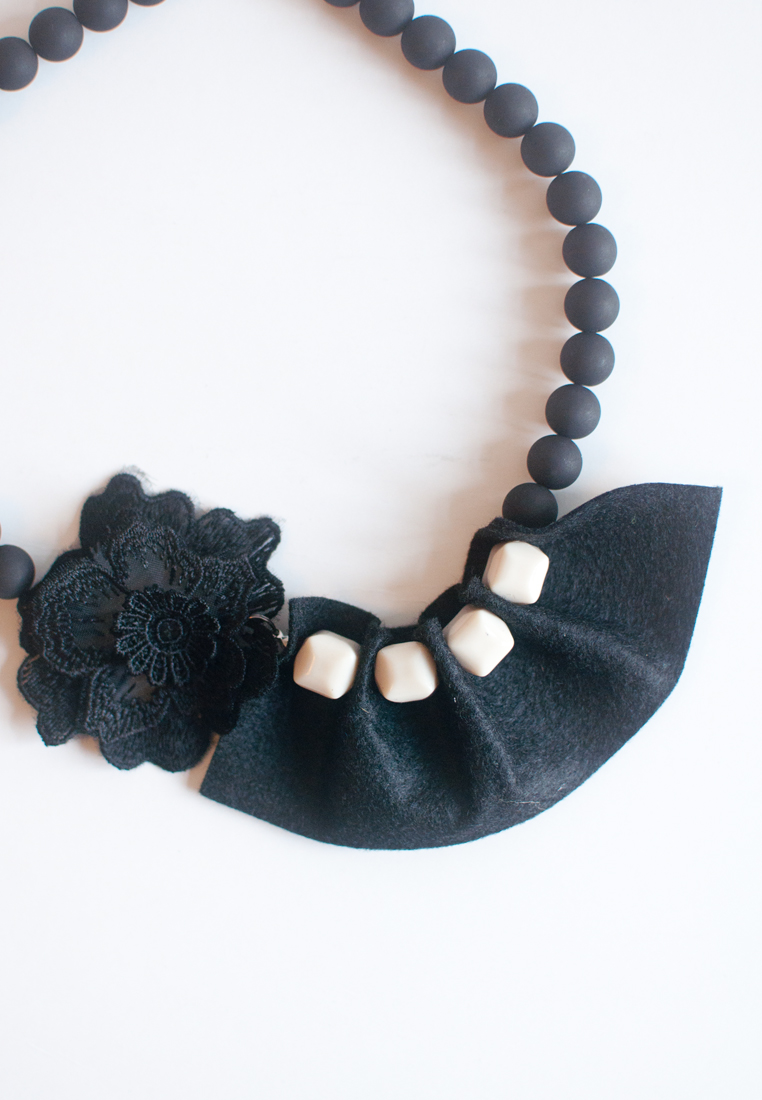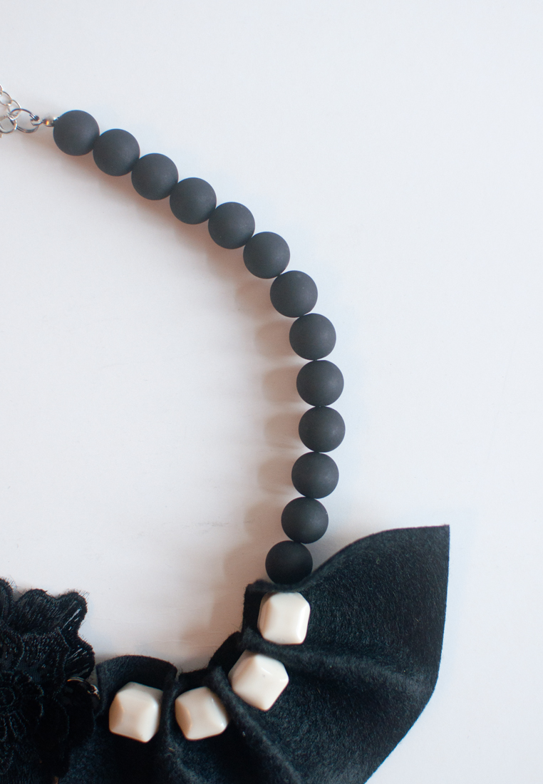 High color contrast beads and felt polished to a high shine define this standout statement necklace.