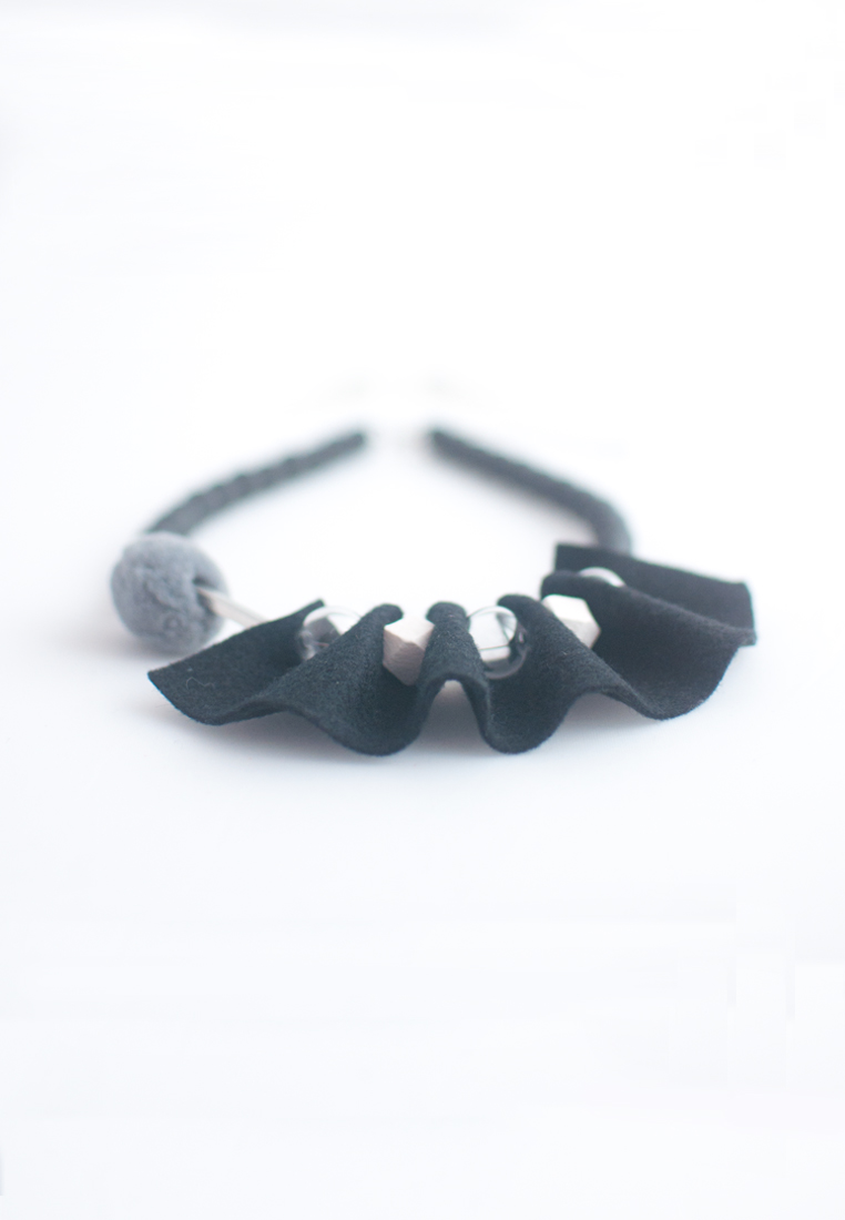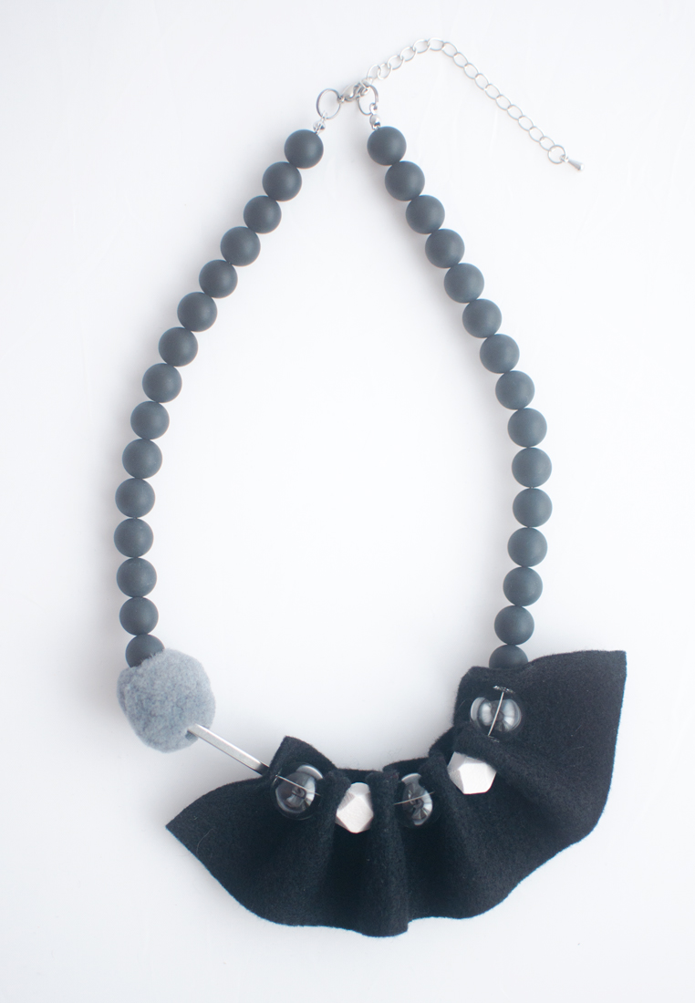 This handmade Necklace with different shapes of beads and felt polished to a high shine define this standout statement necklace.