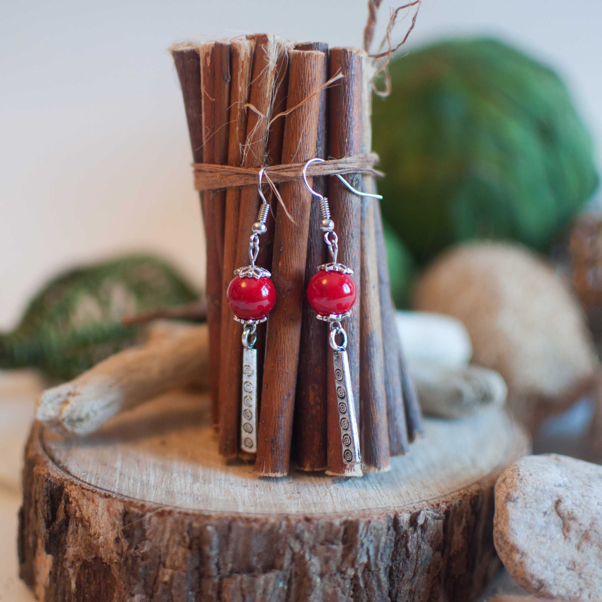 Linked bead and silver cylinder-shaped form sparkling, slimming lines that extend from drop earrings.
