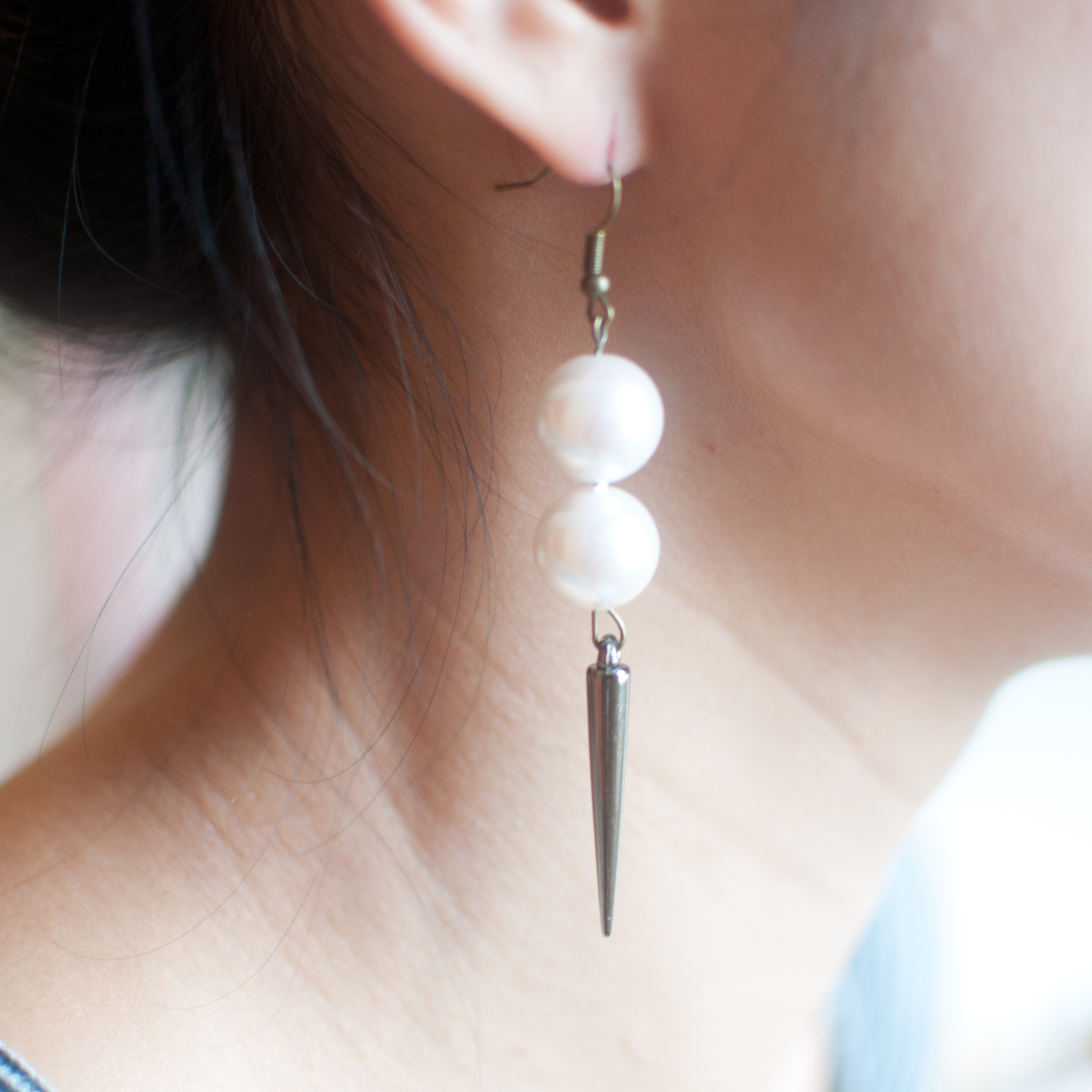 White glass pearls and edgy spikes strike a fun balance in these long, dangle earrings.