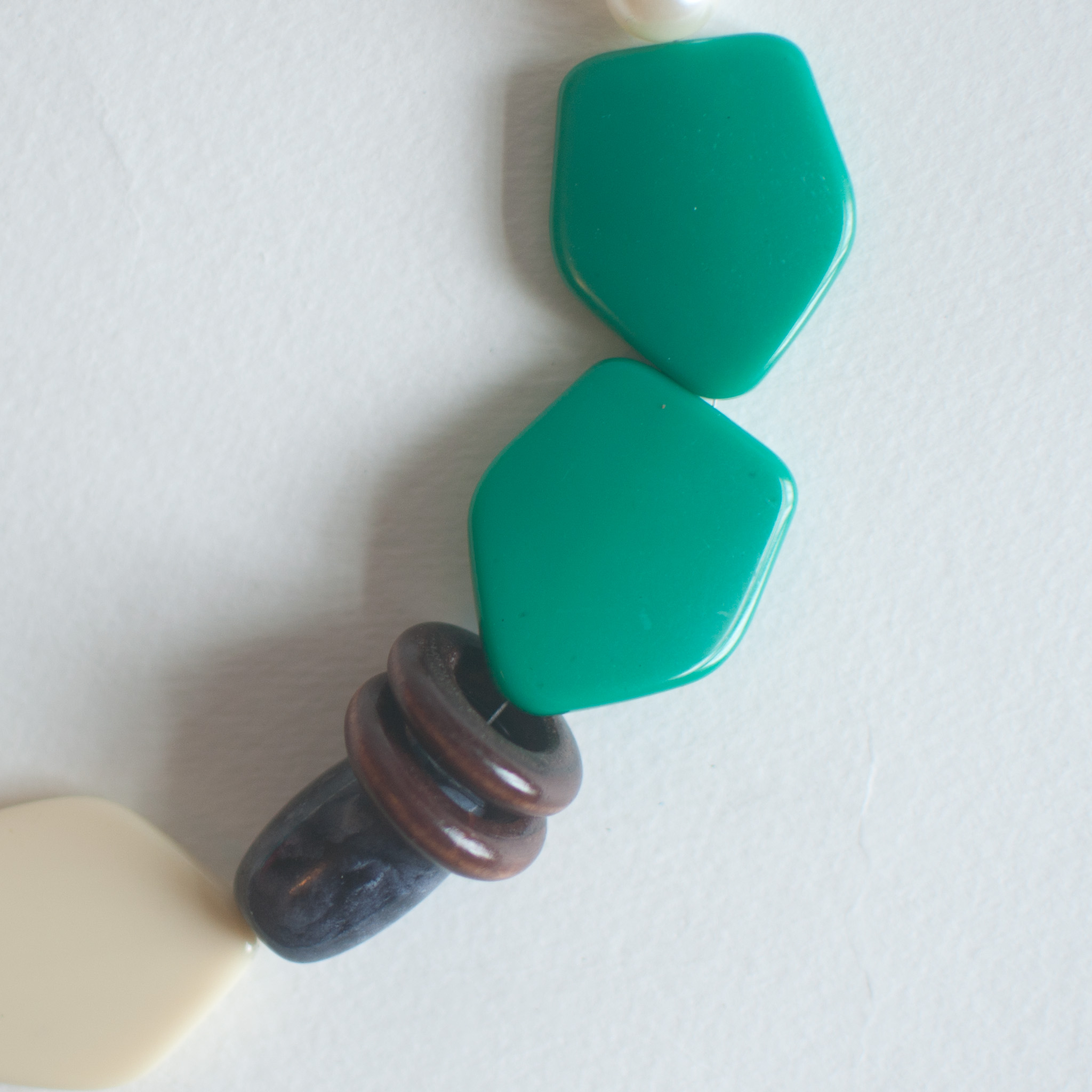 Pentagon Chocolate Round Disc Wooden Beads Pearl Statement Necklace, Ivory Color Sky Blue Turquoise Gray Beaded Pendant Necklace NL0756