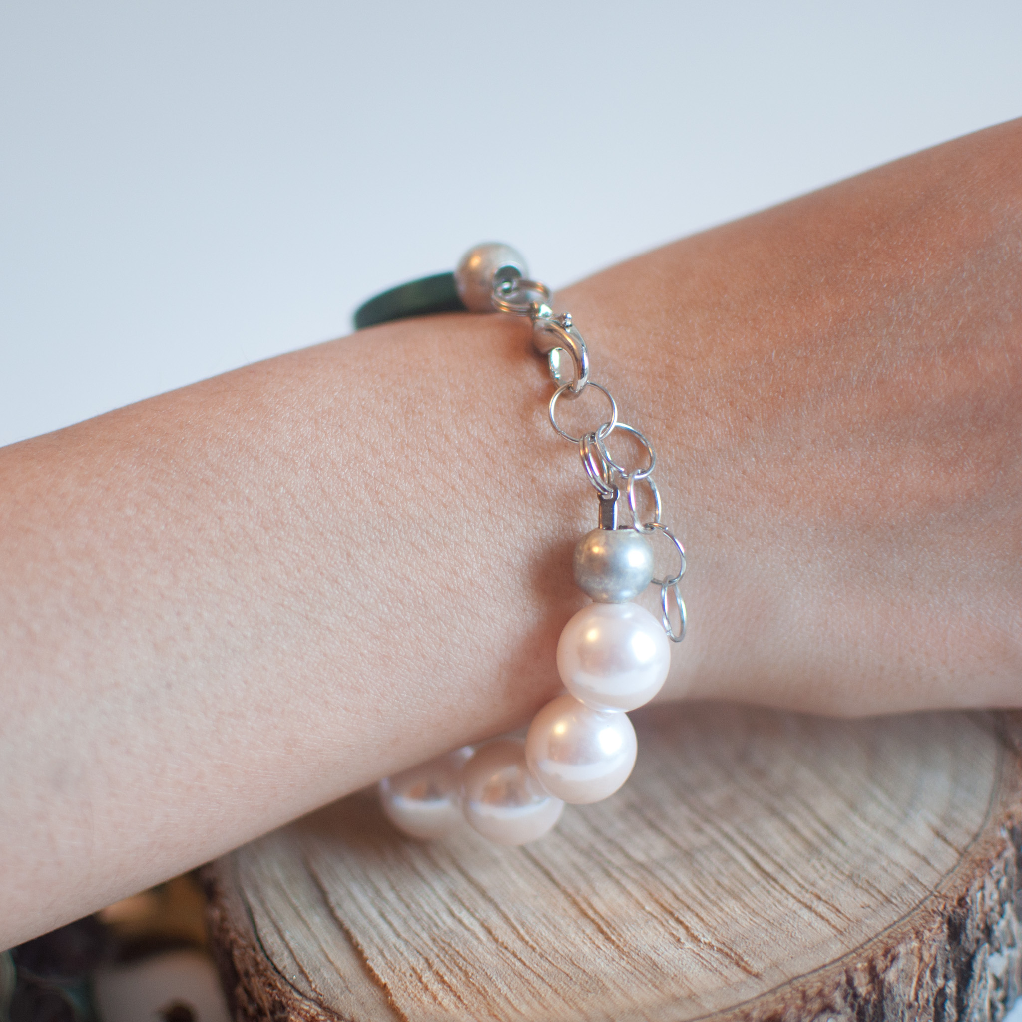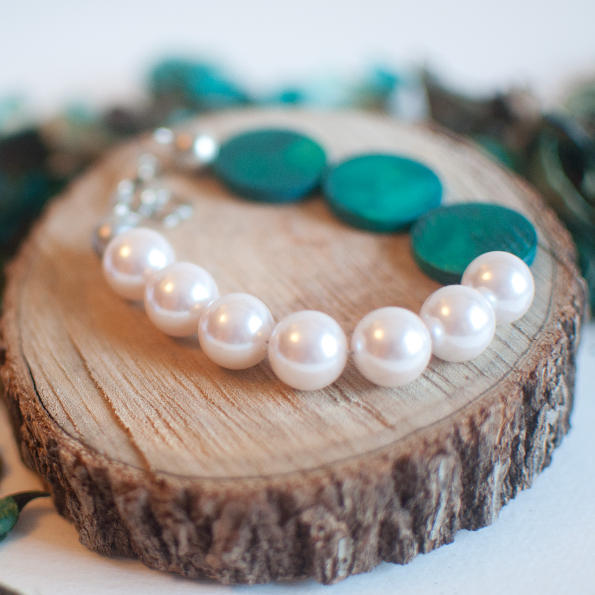 White Glass Pearl Green Disc Beaded Bracelet, BL0677