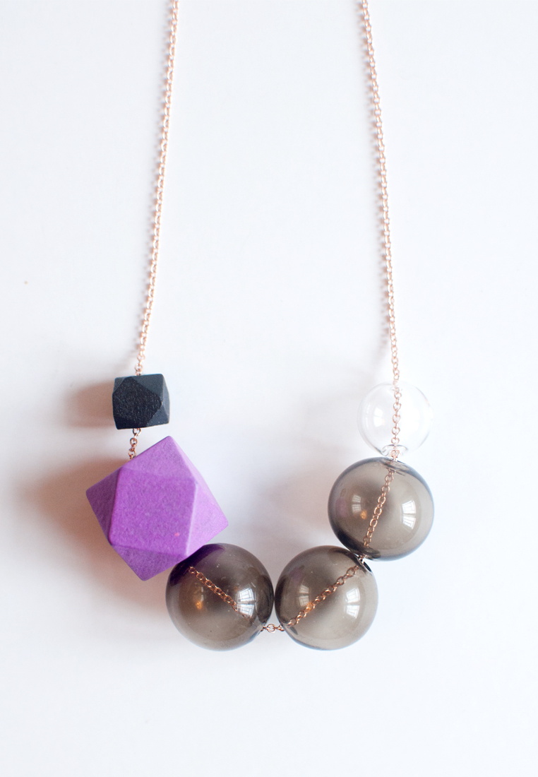 A stylish handcrafted glass necklace offers an impressive style with different shapes of wood beads.