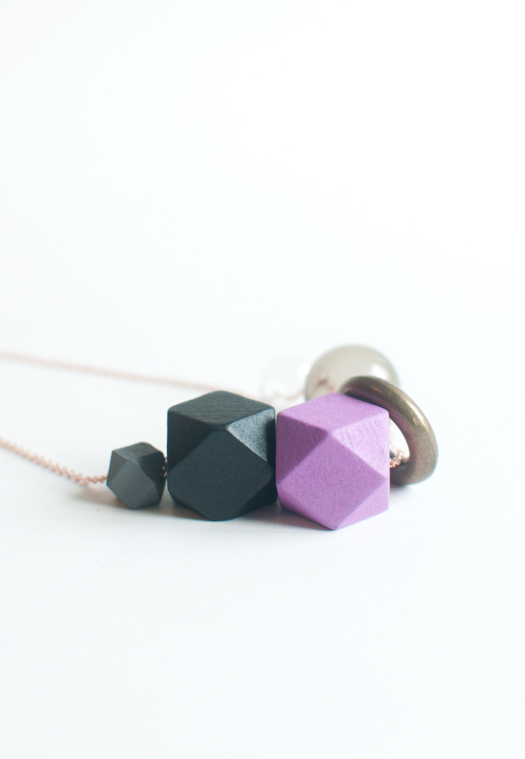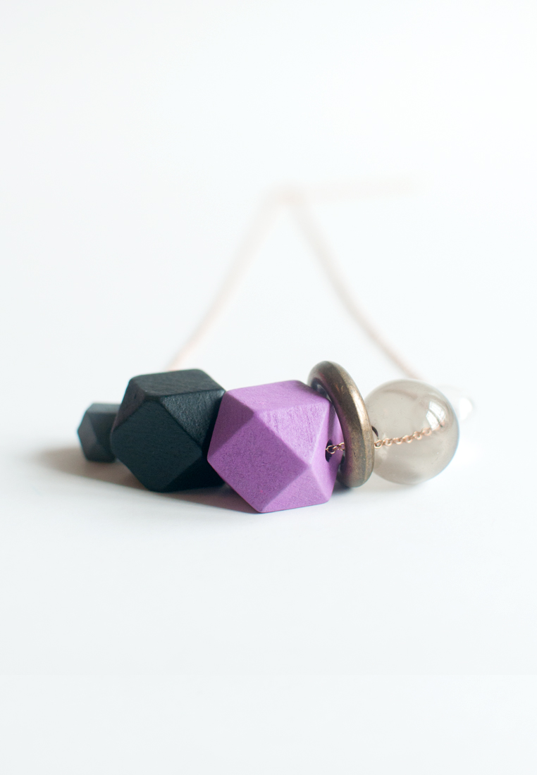 A stylish handcrafted glass necklace offers an impressive style with different shapes of wood beads.