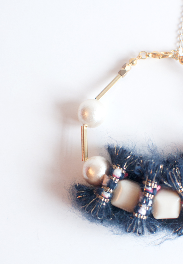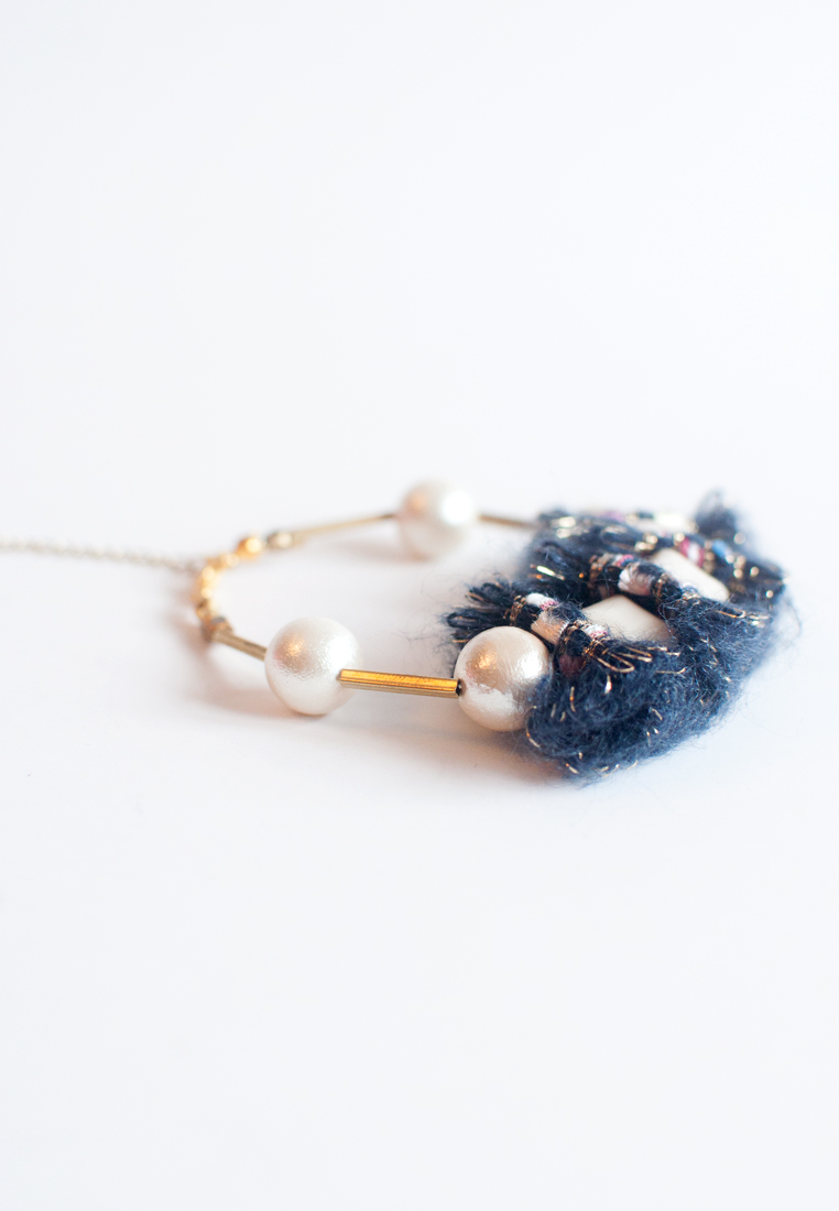 Length: 7 1/2" Weight:19g Felt / gold plated / resin / cotton pearl