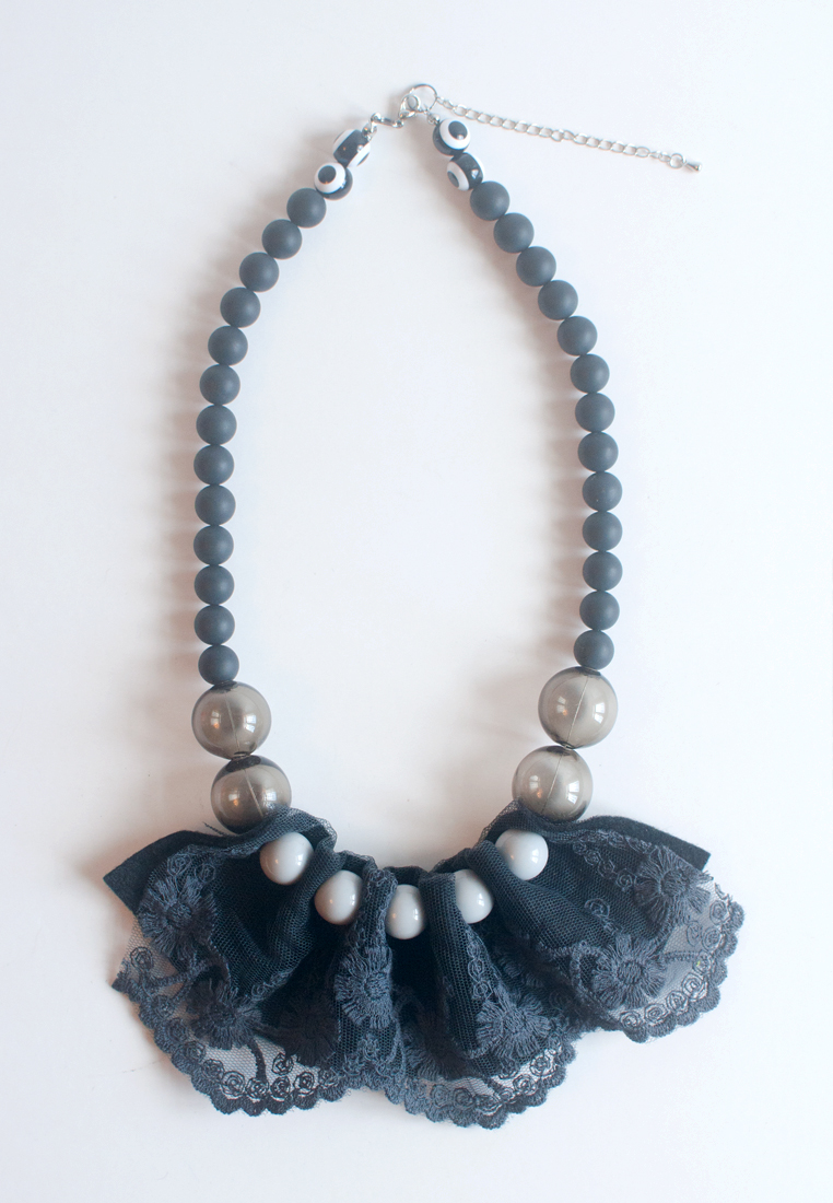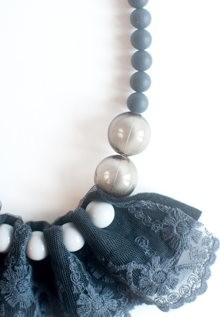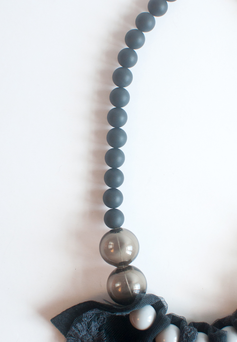This handmade Necklace with glass beads and felt polished to a high shine define this standout statement necklace.