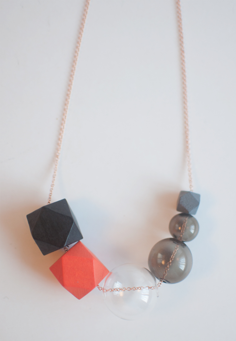 A stylish handcrafted glass necklace offers an impressive style with different shapes of wood beads.